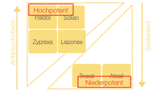Also: Es gibt ja hochpotente Neuroleptika, wie z.B. Haldol, Risperdal und Zyprexa. Diese Substanzen heißen hochpotent, weil sie sehr potent gegen Wahn und Halluzinationen wirken, aber nur recht wenig sedieren.