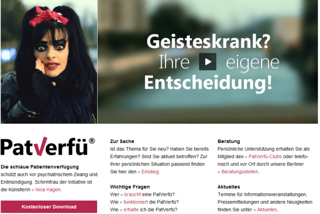 • Dies alles könne man durch die „Patverfü“ verhindern. In dieser steht, dass kein Psychiater einen untersuchen darf und schon gar keine Diagnose aus dem Kapitel F der ICD-10 stellen darf. Und so könne eine Zwangsbehandlung also vermieden werden. (Was natürlich nicht Teil einer Patientenverfügung sein kann. Es wäre auch schlimm, wenn ein kranker Mensch nicht von einem Arzt untersucht werden dürfte, und also nicht behandelt werden könnte. Das geht natürlich nicht.)