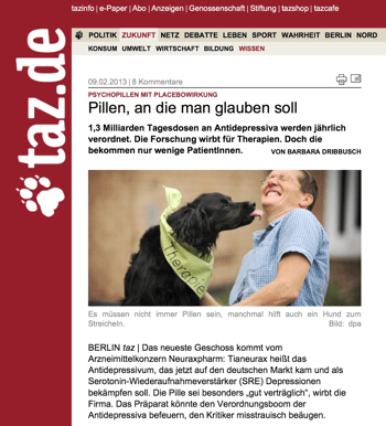 Am Freitag hat die Taz über ein neues Antidepressivum berichtet. In diesem Zusammenhang schreibt sie, dass im Netz heftig über die Vor- und Nachteile der einzelnen Substanzen diskutiert wird, und nennt diesen blog hier als Quelle! Danke an alle Kommentatoren und alle, die hier in den Kommentaren ihre Erfahrungen berichten!