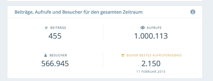 Soeben hat der Psychiatrie to go blog die magische Marke von einer Millionen Aufrufen durchwandert. Über 560.000 Besucher waren schon hier. Das ist echt cool und ich freue mich riesig über diese Resonanz.