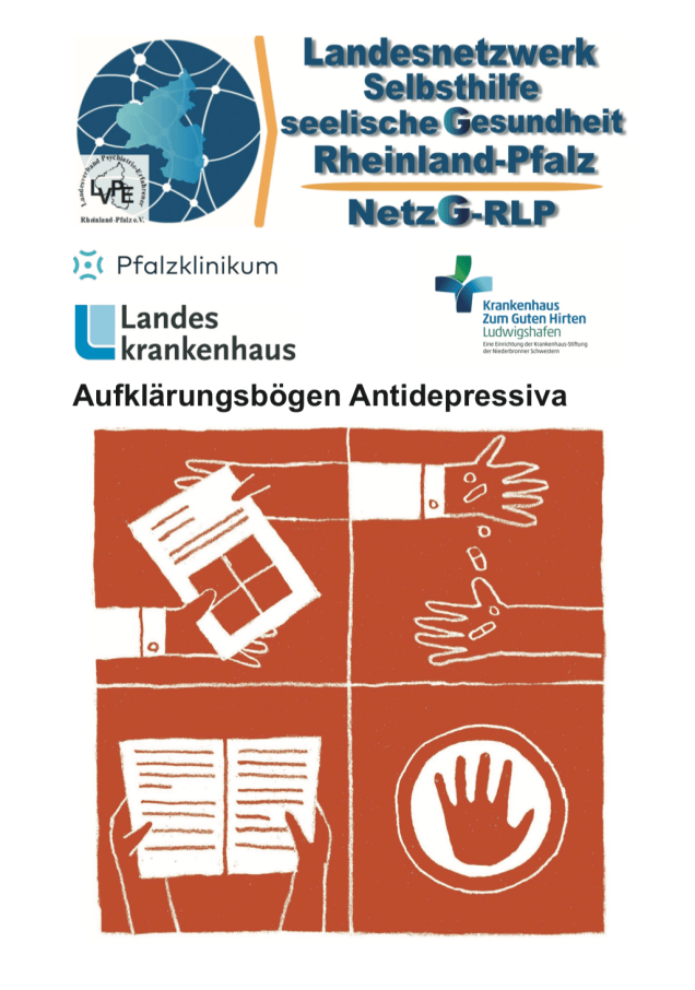 Das Landesnetzwerk Selbsthilfe seelische Gesundheit Rheinland Pfalz hat in Zusammenarbeit mit Ärzt:innen verschiedener psychiatrischer Kliniken einen Aufklärungsbogen für Antidepressiva erstellt, der die relevanten Fragen ausnahmsweise mal in verständlicher Sprache beantwortet. Mit 20 Seiten ist er nicht kurz, aber verständlich. Ihr findet den Bogen hier.