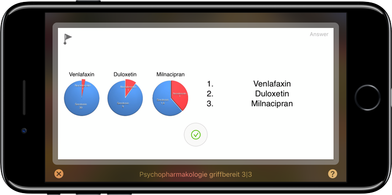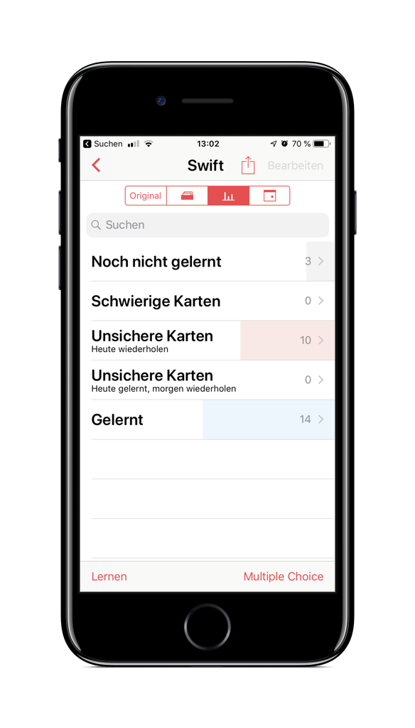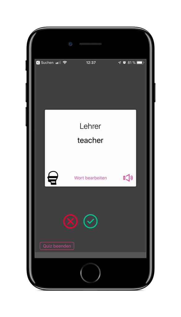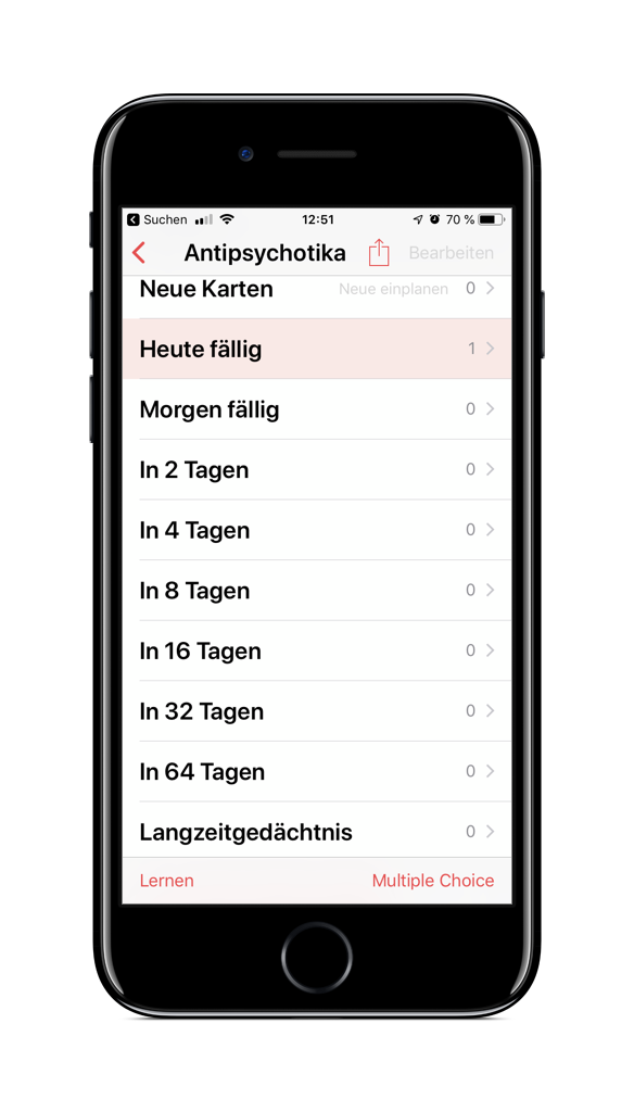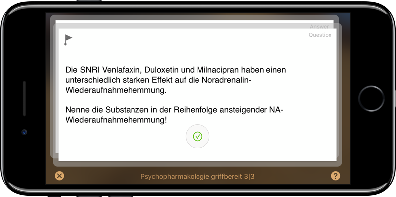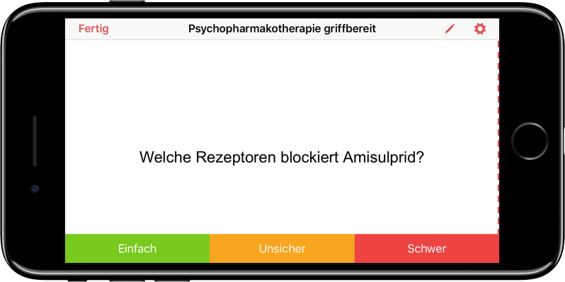 Eine lange Zeit habe ich Studies verwendet. Es bietet wirklich sehr viele Möglichkeiten, unter anderem Karten mit mehr als zwei Seiten, Bilder, Multiple-Choice Antworten und einiges mehr. Es ist wahrscheinlich die leistungsfähigste App. Am iPhone sieht der Fragemodus so aus: