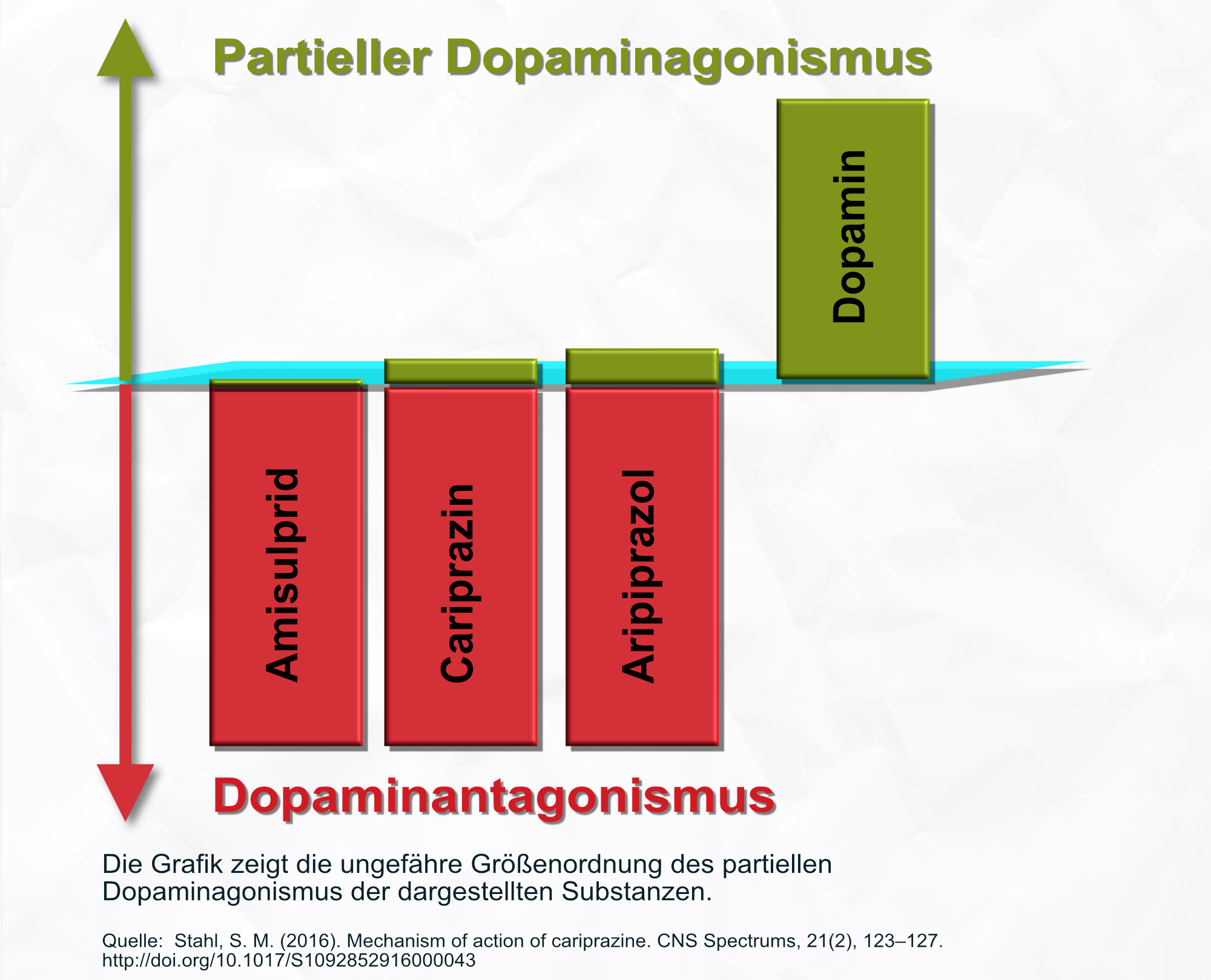 Aripiprazol hat eine etwas höhere intrinsische dopaminerge Aktivität, und es wird auch öfter mit Akathisie in Verbindung gebracht. Brexpiprazol ist zwar seit kurzem in der EU zugelassen, spielt aber in Deutschland praktisch noch keine Rolle. Seine intrinsische Aktivität ist ungefähr so hoch wie die von Cariprazin. In der Grafik oben würde Brexiprazol genau so aussehen wie Cariprazin. Cariprazin hat im Vergleich zu Aripiprazol eine etwas mildere intrinsische Aktivität, und den Studien nach ist die Verträglichkeit, insbesondere in Bezug auf Akathisien, besser. Es zeigt in den bisherigen Studien eine bessere Wirksamkeit auf Negativsymptome, möglicherweise aufgrund der dopaminergen Komponente. Die Grafik oben habe ich erstellt, um zu zeigen, dass alle drei Substanzen Amisulprid als Vertreter der Antipsychotika ihne relevante intrinsische Aktivität) überwiegend die Übertragung von Dopamin blockieren, so auch Aripiprazol und Cariprazin. Cariprazin hat eine etwas mildere intrinsische dopaminerge Aktivität als Aripiprazol, was mit einer besseren Verträglichkeit einhergehen kann. Die Größenverhältnisse sind nicht mathematisch korrekt, sie repräsentieren keine Meßwerte der Substanzen, sie sind nur ein optischer Anhalt, um sich eine Größenvorstellung der Effekte zu machen. Ich habe die Größenverhältnisse zwischen der Blockade und der Aktivität selbst frei gewählt. Das Verhältnis der intrinsischen Aktivität von Aripiprazol und Brexpiprazol/Cariprazin habe ich an [1] angelehnt, aber auch nicht mathematisch exakt dargestellt.
