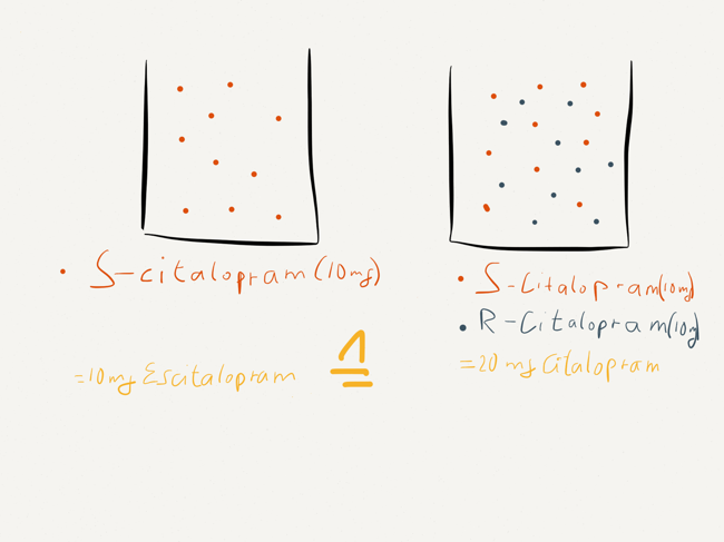 So ist es auch beim Citalopram. Das ist eine 50 zu 50 Mischung des antidepressiv wirksamen S-Citaloprams (handlicher benannt als Escitalopram) und des nicht wirksamen spiegelbildlichen R-Citaloprams.