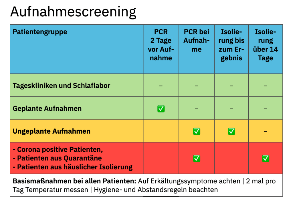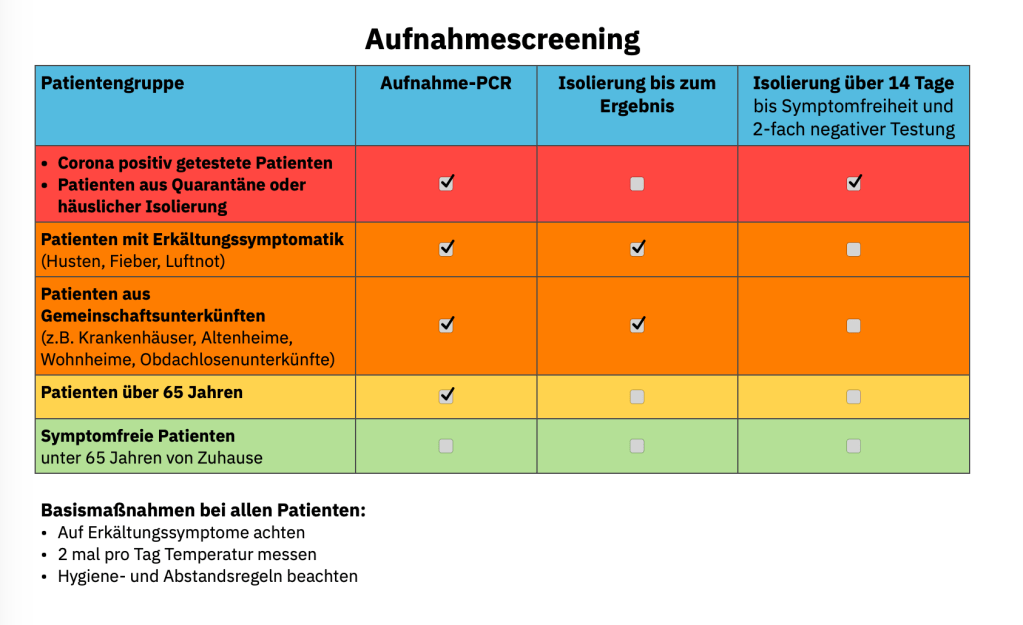 - Aufnahmen: Wir führen nur noch Notfallaufnahmen durch, keine elektiven verschiebbaren Aufnahmen. Kein Patient darf auf die Station, bevor ihn ein Arzt gesehen hat. Patienten zur Aufnahme melden sich an der Pforte, diese ruft den AvD an, der spricht im im hierfür reservierten Aufnahmezimmer mit dem Patienten. Risikostratifizierung nach dem Schema des RKI.