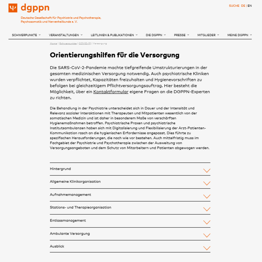Wir haben sowohl für den offen stationären Bereich als auch für den geschlossen stationären Bereich eine Planung aufgestellt, wo welche Patientengruppe behandelt werden kann. Es wäre in der mittelfristigen Zukunft wünschenswert, Patienten, die auf eine Corona-freie Station aufgenommen werden sollen, zunächst zu testen, gegebenenfalls bis zum Ergebnis der Testung auf einer Aufnahmestation zu isolieren, und erst bei negativem Test auf die Station aufzunehmen. Das ist aber aktuell nicht möglich, weil noch die Testkapazitäten fehlen. Solange wird nach klinischer Wahrscheinlichkeit vorgegangen: Fieber oder Husten UND Kontakt zu einer positiv getesteten Kontaktperson: Keine Aufnahme auf eine Corona-freie Station, sondern bevorzugt häusliche Isolierung, bei schwerem somatischen Krankheitsbild Aufnahme auf eine Infektionsstation und bei schwerem psychiatrischen Krankheitsbild, das die Aufnahme in einer psychiatrischen Klinik unabdingbar macht, Aufnahme in einen isolierten Bereich der Psychiatrischen Klinik.