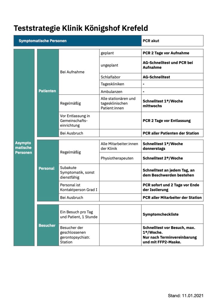 - Personal auf dem Gelände der kooperierenden somatischen Klinik: Mitarbeiter:innen sollen entweder auf dem Gelände der somatischen Klinik oder im Psychiatrischen Krankenhaus arbeiten. Absprachen zwischen beiden Bereichen werden telefonisch durchgeführt.