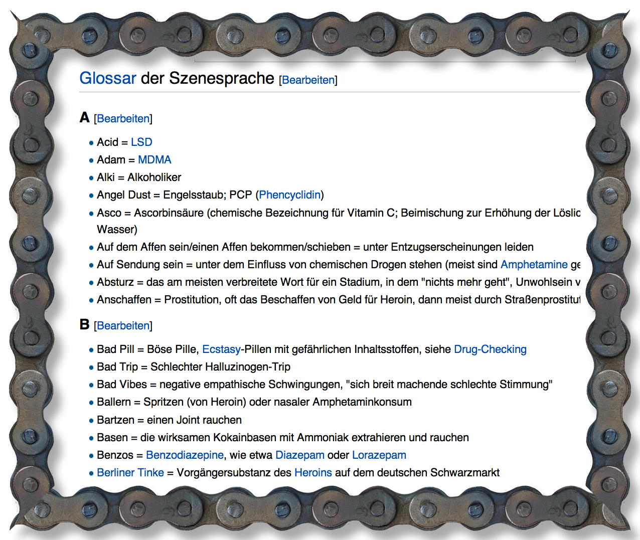 Jede Szene hat ihre eigene Sprache. So auch die Drogenszene. Für Psychiater, die in ihrem übrigen Leben nicht sooo viel Kontakt mit der Szene haben, kann dieses Glossar der wikipedia helfen, manche mysteriösen Begriffe richtig zuzuordnen…
