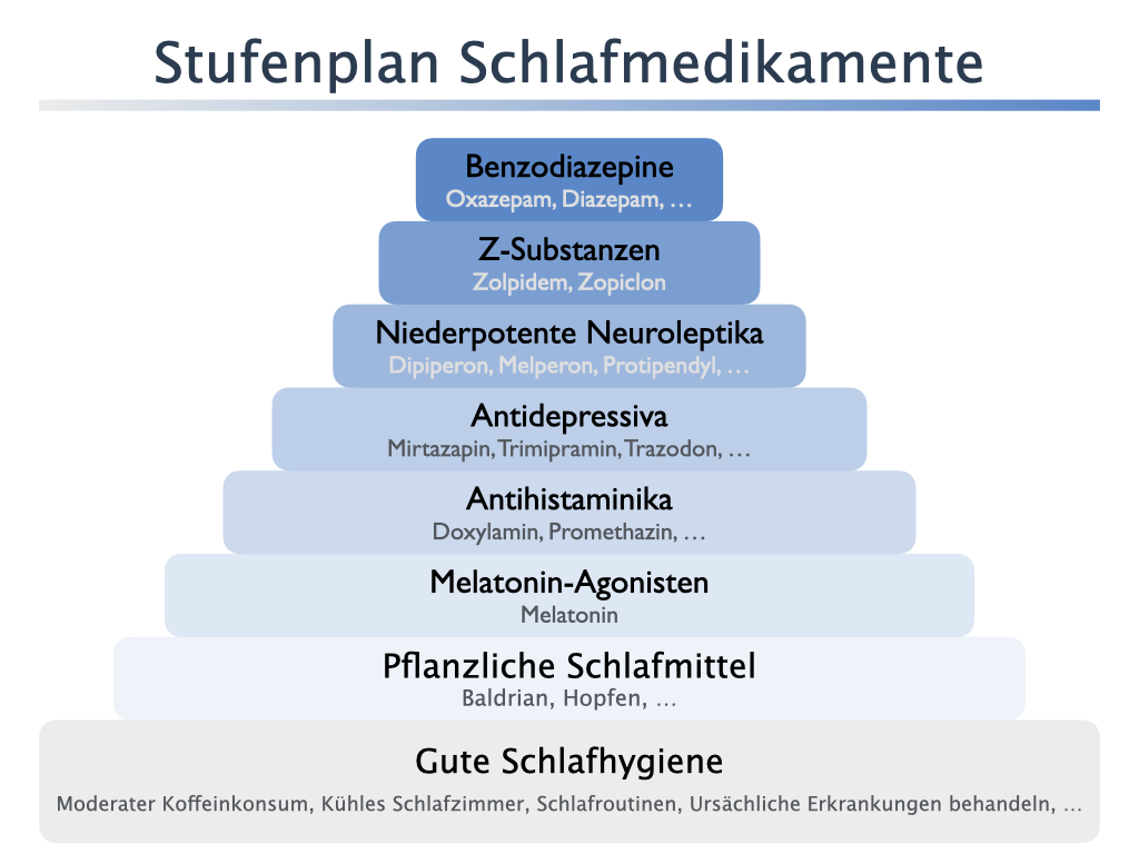Dennoch gibt es Situationen, in denen ein Schlafmittel sinnvoll sein kann. Es gibt sehr unterschiedliche Schlafmittel. Gemeinsam ist ihnen, dass es sedierende Substanzen sind, die in der Absicht gegeben werden, den Schlaf zu verbessern. In diesem Kapitel stelle ich zunächst einen aus meiner Sicht sinnvollen Eskalationsplan dar und anschließend in dieser Reihenfolge die Pharmaka mit ihren jeweiligen Eigenschaften.